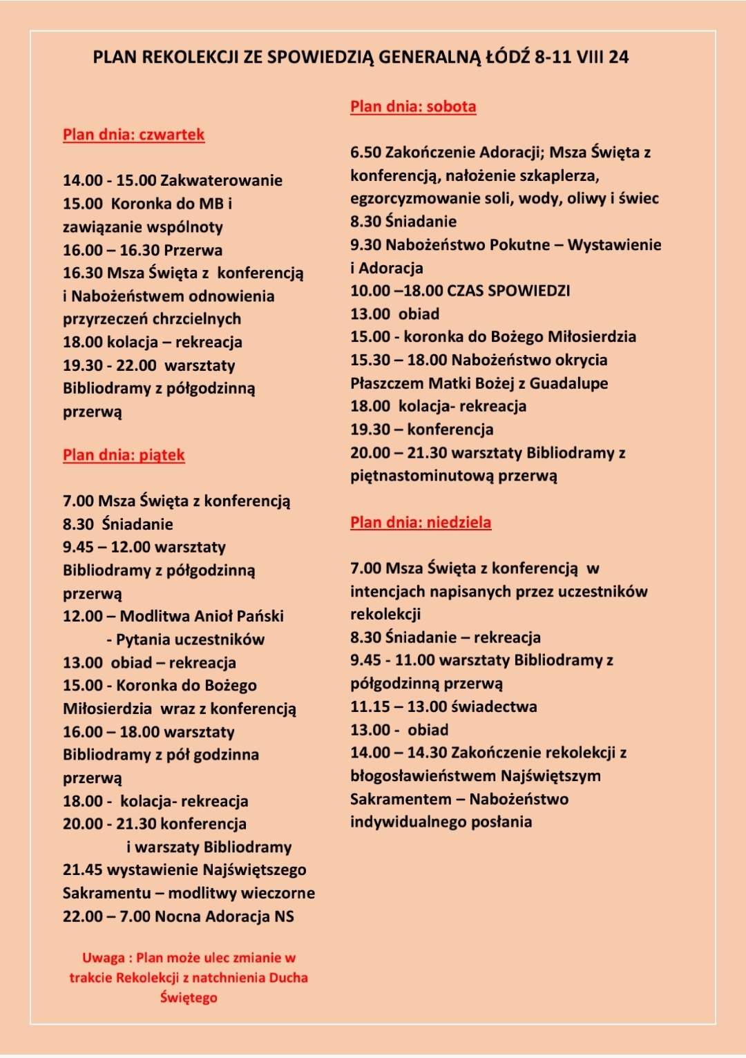 Okrycie Płaszczem Matki Bożej z Guadalupe, Nałożenie szkaplerza Egzorcyzmowanie soli, wody, oleju i świec, Warsztaty Bibiliodramy