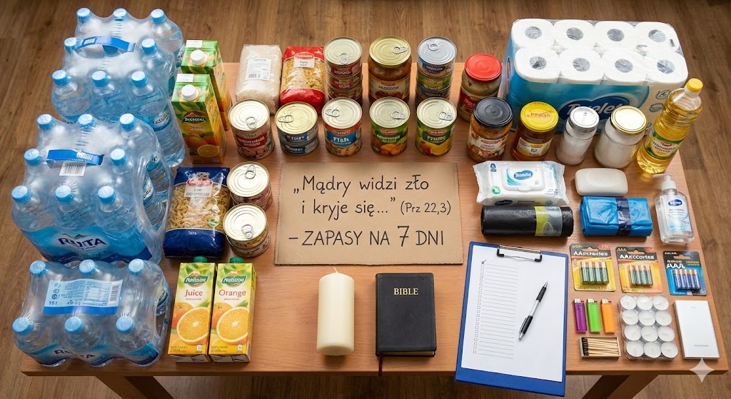 **„Mądry widzi zło i kryje się, a nierozważni idą dalej i ponoszą karę” (Prz 22,3)** Ta lista jest zaprojektowana dla **2-4 osób na okres około 7 dni**. Produkty te mają długie terminy ważności i nie wymagają lodówki.  1. WODA (Najważniejszy punkt) Bez jedzenia przeżyjesz tygodnie, bez wody tylko 3 dni.
