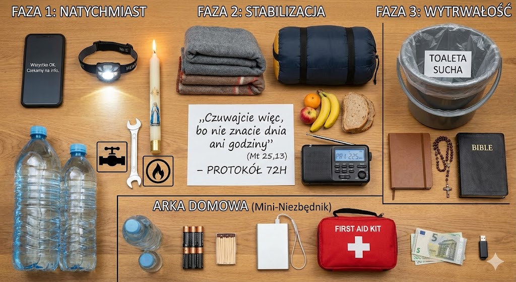 **„Czuwajcie więc, bo nie znacie dnia ani godziny” (Mt 25,13)** W sytuacji nagłego kryzysu (brak prądu, powódź, niepokoje) pierwsze 3 doby są kluczowe. Ta lista pomoże Ci opanować chaos i zadbać o rodzinę. ##  FAZA 1: NATYCHMIAST (0–3 GODZINY) – Zabezpieczenie i Spokój * [ ] **Duchowy fundament:** Krótka modlitwa o